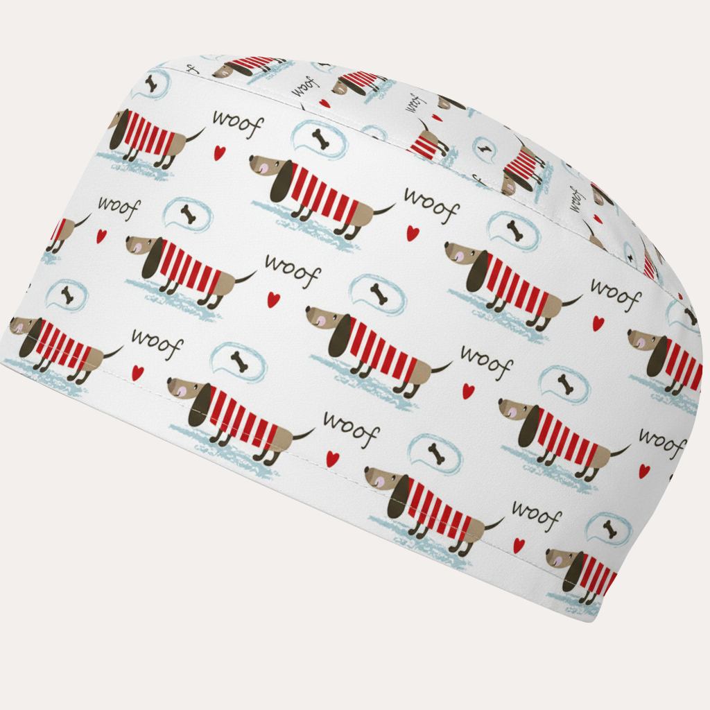 Gorro de quirófano de algodón - Estampado perros Teckel fondo blanco.
