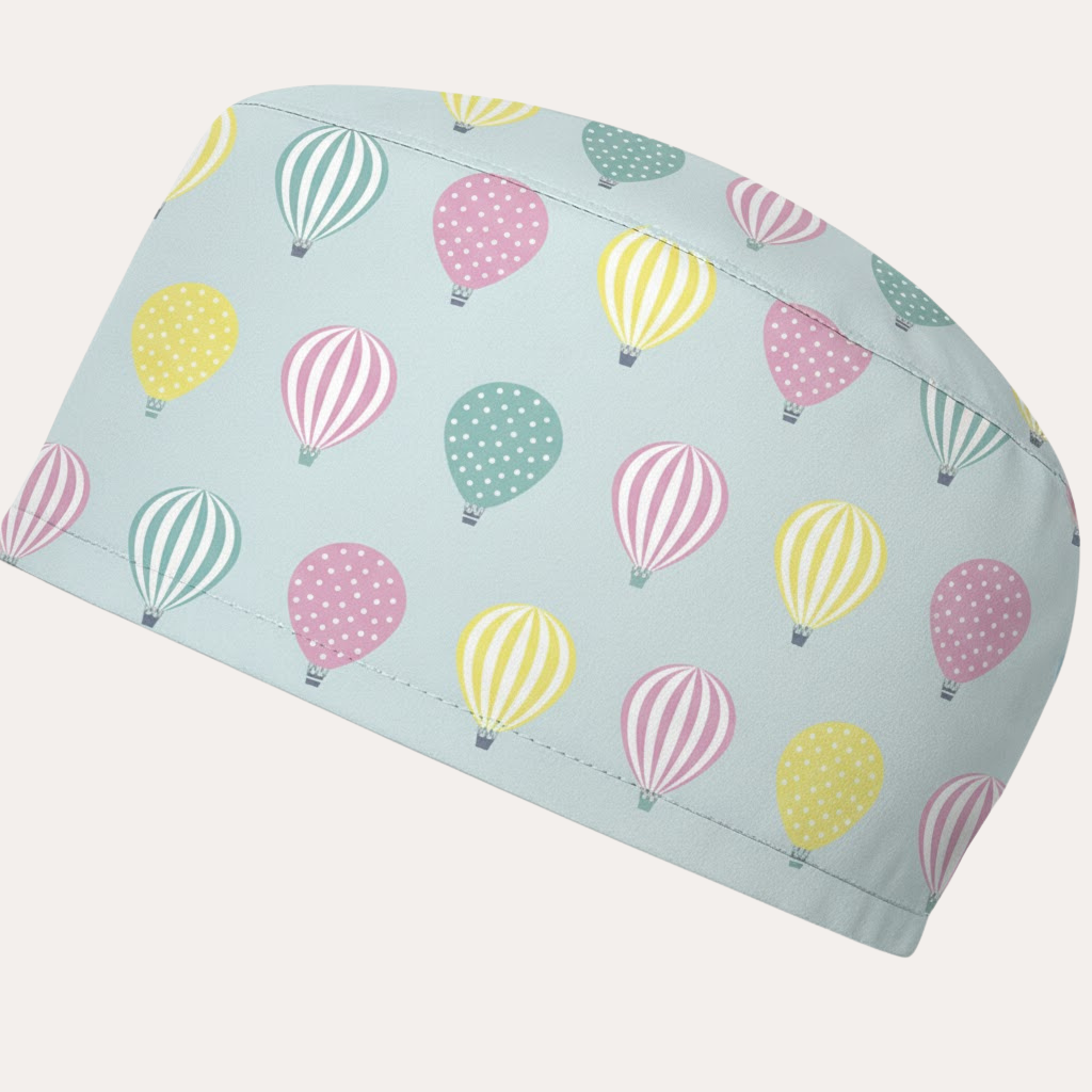 Gorro quirúrgico de poliéster estampado globos aeroestáticos en colores pastel